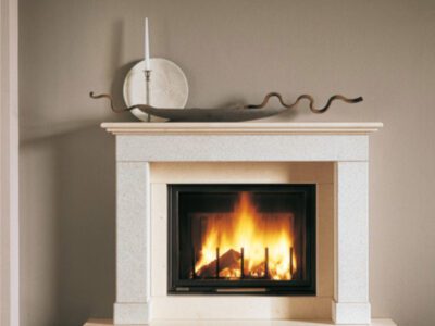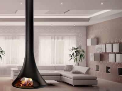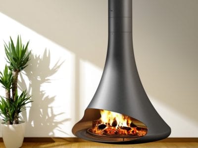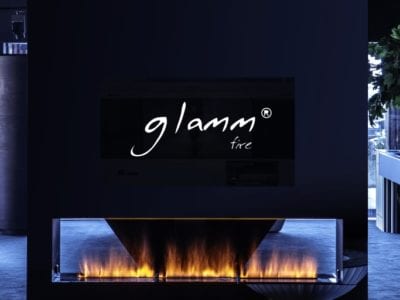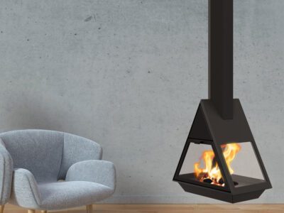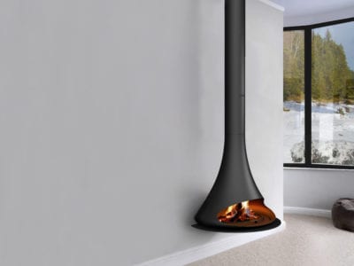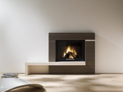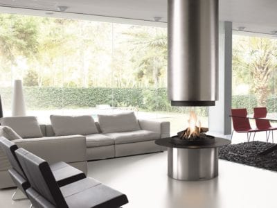 Șemineu din sticlă centrală cu control integrat al combustiei, o carcasă din sticlă COR-TEN din oțel inoxidabil sau oțel lăcuit într-un RAL strălucitor.